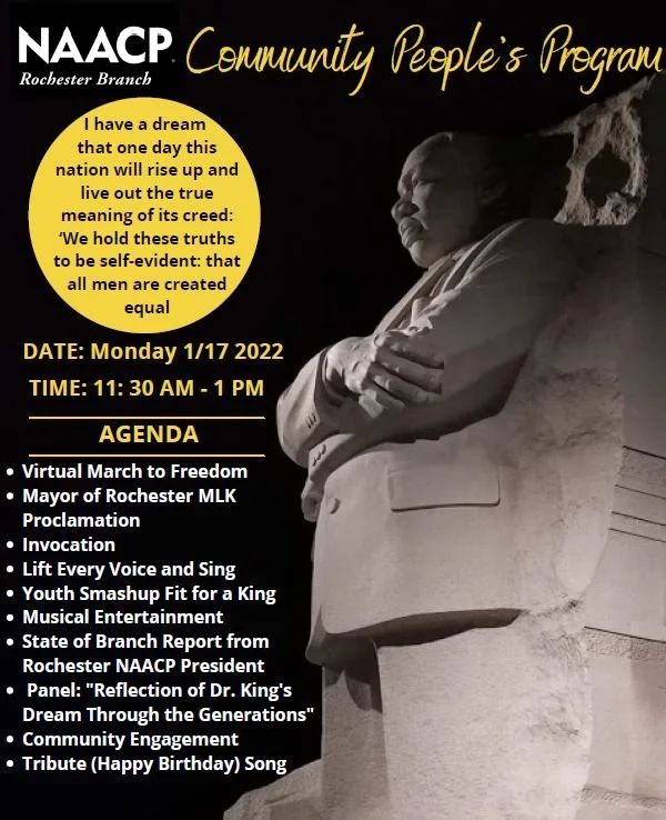 The event will feature Virtual March to Freedom, City of Rochester MLK Day Proclamation, Lift Every Voice and Sing, Entertainment, NAACP State of the Branch Report, and Panel Session to reflect on Dr. King's dream.